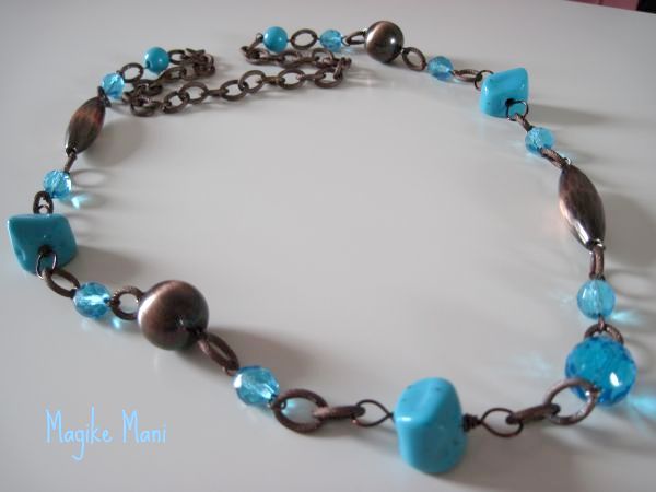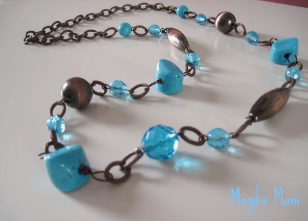 La catena è opaca e non riflette la luce così ho pensato di aggiungere dei mezzi cristalli di un bel colore turchese e i famosi “sassi di resina”, che a me piacciono tanto, questa volta turchesi…