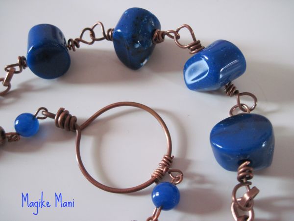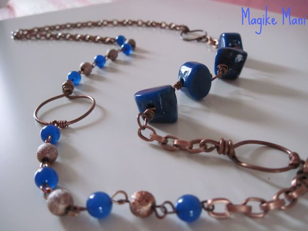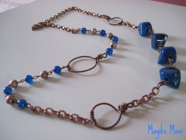E' vero, rame e blu sono sempre azzeccatissimi, poi questa è una tonalità di blu davvero bella… in foto si nota poco ma le perline di agata hanno una leggera trasparenza, sono fantastiche!!!ciao e buona giornataGrazia