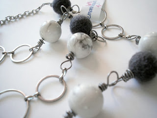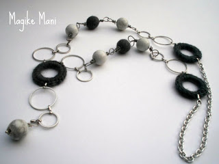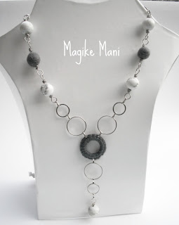 Effettivamente questa collana ha proprio il colore della nebbia, ma mi piace tantissimo…mi piace il contrasto tra la calda morbidezza delle palline di feltro grigie e del cerchio lavorato a mano in morbida lana, e la fredda durezza (o la dura freddezza?) di queste bellissime perle di Aulite che hanno questo “effetto marmo”, bianche con delle belle striature di grigio.