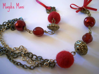 E veniamo alle perle, ancora una volta ho usato un contrasto che mi piace moltissimo ovvero le perle di vetro cerate lucide e le palline di feltro morbide e opache e… notizia strepitosa sono FATTE A MANO!!!