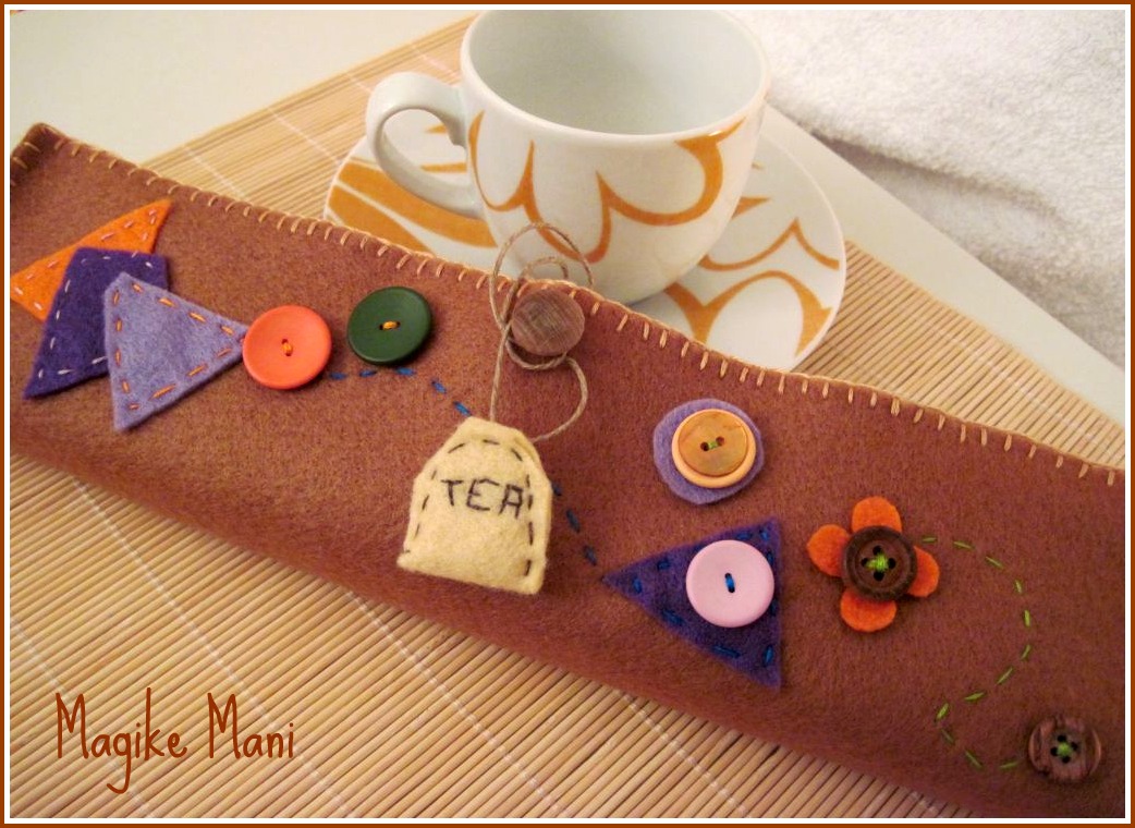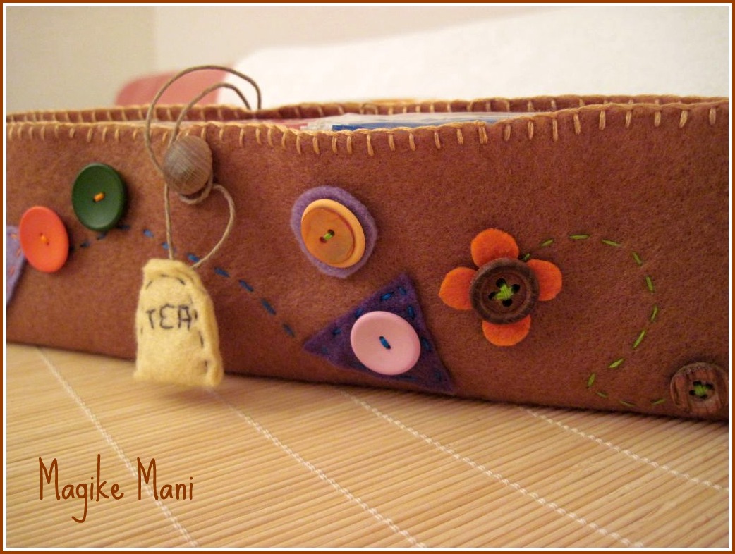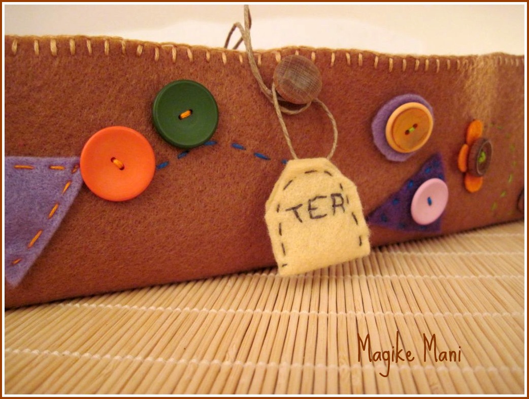Ho usato feltro color te’ (appunto) qualche altro scampolino ritagliato e cucito qual e là, bottoncini colorati e fili da ricamo….