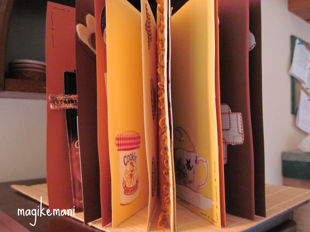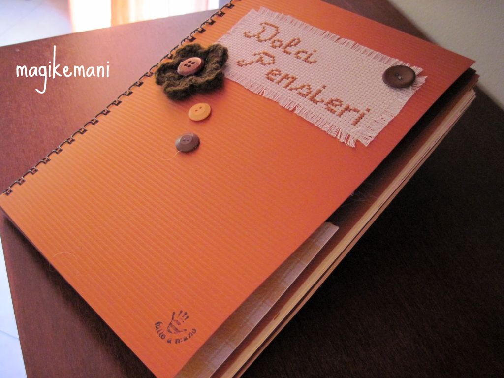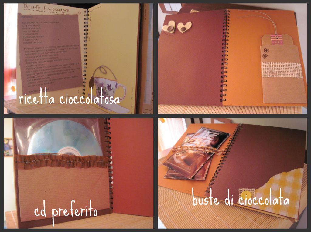 cosa potevo creare da mandarle…. pensa che ti ripensa ho deciso per una creazione un po’ diversa ed ho creato questo quadernetto fatto con del cartoncino nei colori del cioccolato che ho fatto rilegare ed ho un po’ scrappato all’interno.