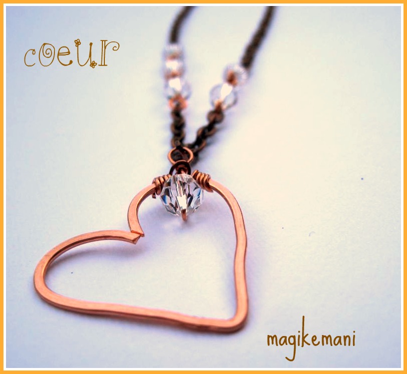 Ciao Grazia, si direi che stavolta hai vinto tu. A volte scovo tutorial che spiegano come fare il cuore col filo, ma io non li ho mai trovati così facili da fare a dire il vero… ehehehe! La tua collana è bellissima. Anche io ho iniziato con i cristalli, poi abbandonati per cose più grezze e meno luccicose, ogni tanto, come te, li uso per dare un raggio di luce…. ciaooo e buon week end.