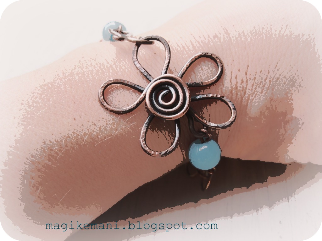 Nell’attesa di tornare nella fase output vi mostro un bracciale che adoro, scelto da un’amica da regalare per Natale. Ve la ricordate la spilla fiore? Ecco il fiore del bracciale è lo stesso: filo di rame modellato, cotto, scartavetrato, texturizzato e ripassato con smerigliatina…ha preso questo colore fantastico con delle sfumature stupende.