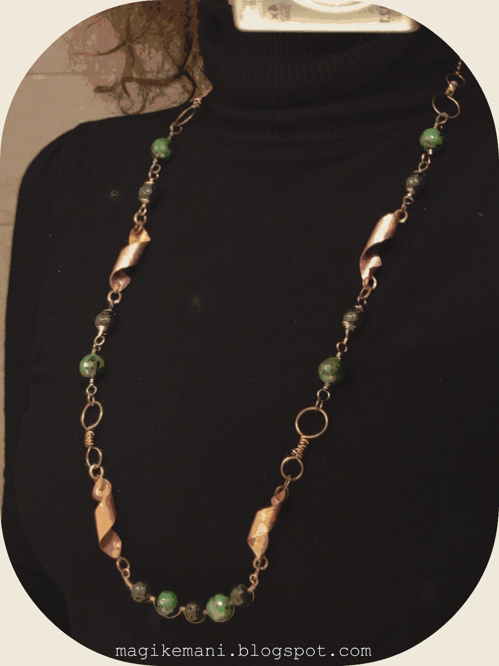 Eccola la collana “riccioli” creata con riccioli ritagliati da lamina di rame, scurita a fiamma, martellata e modellata…