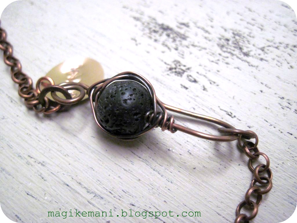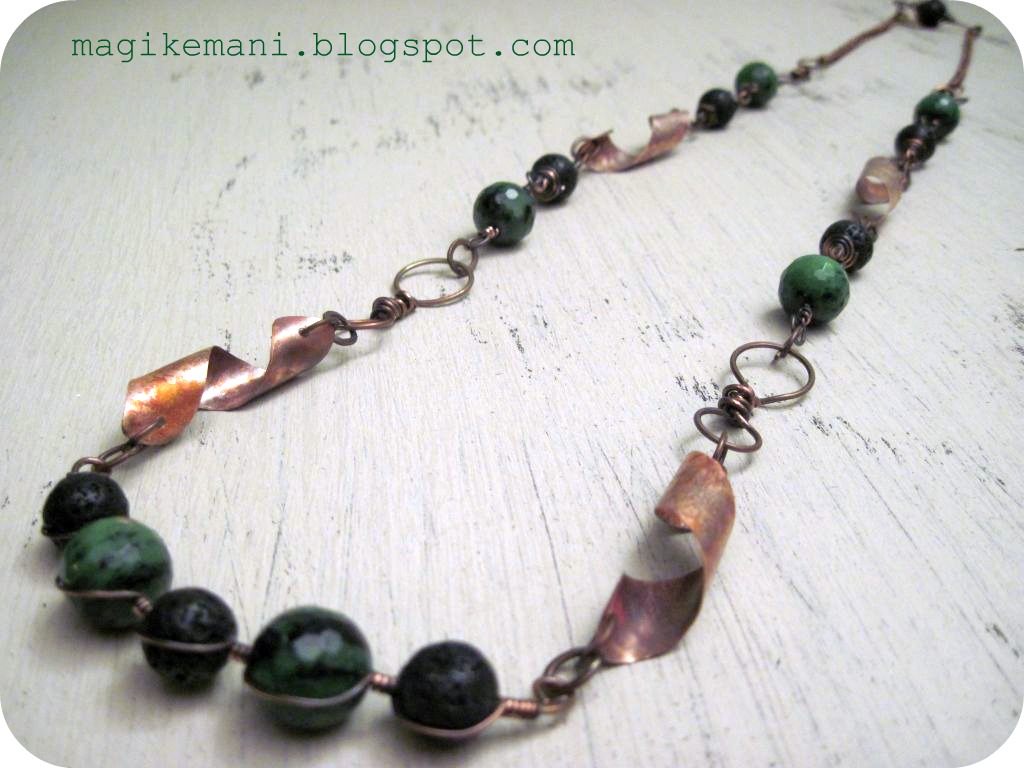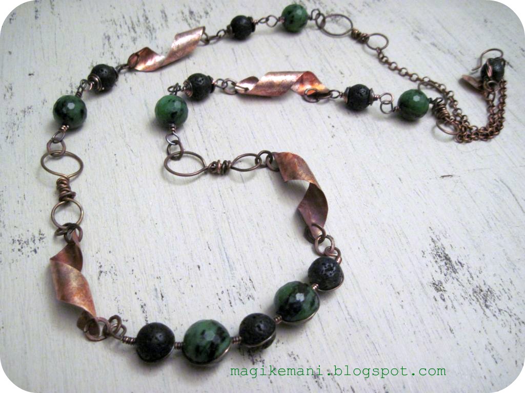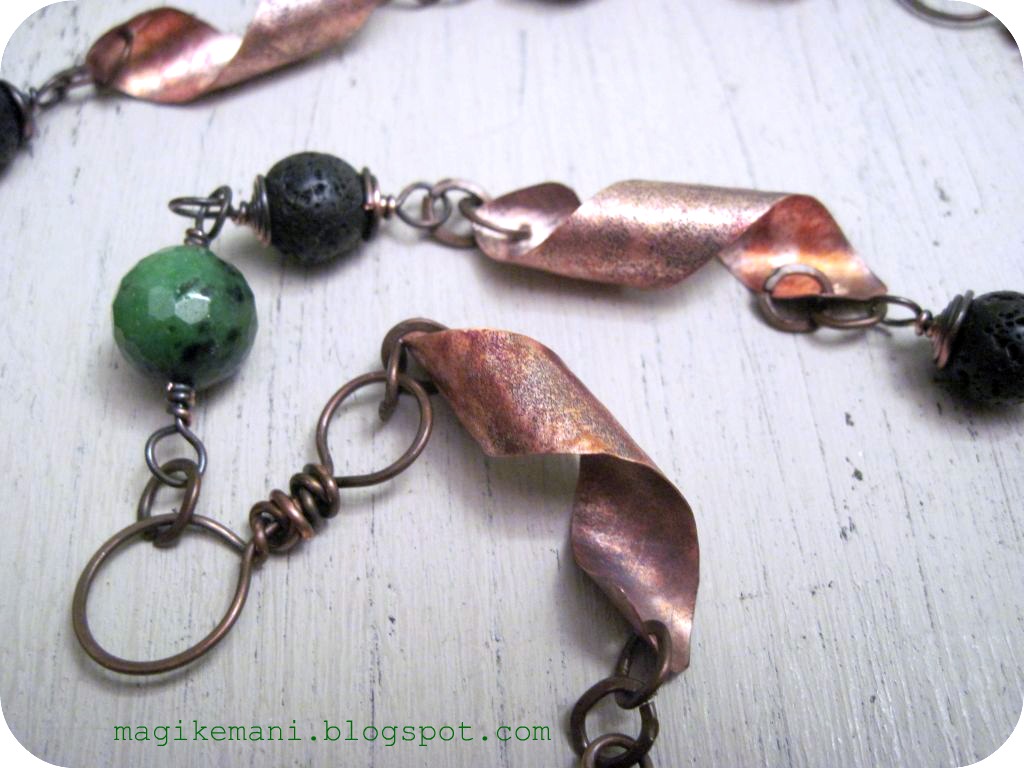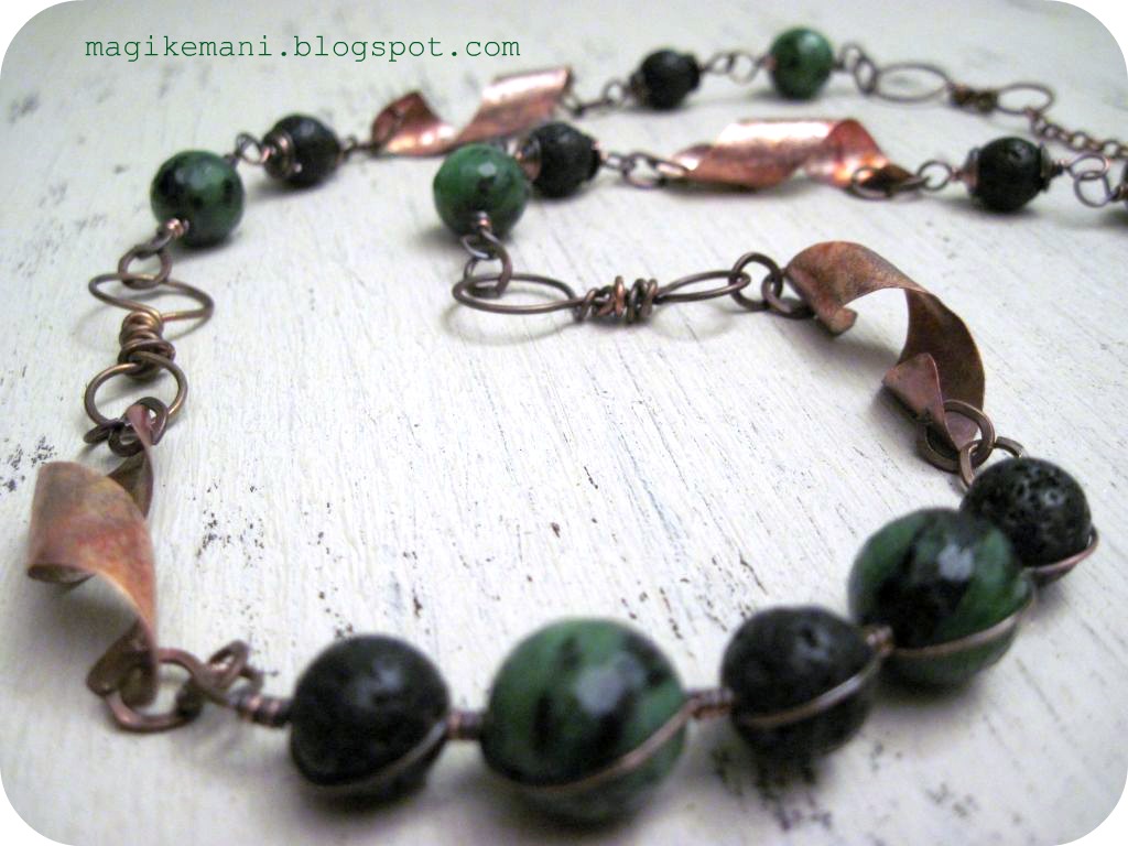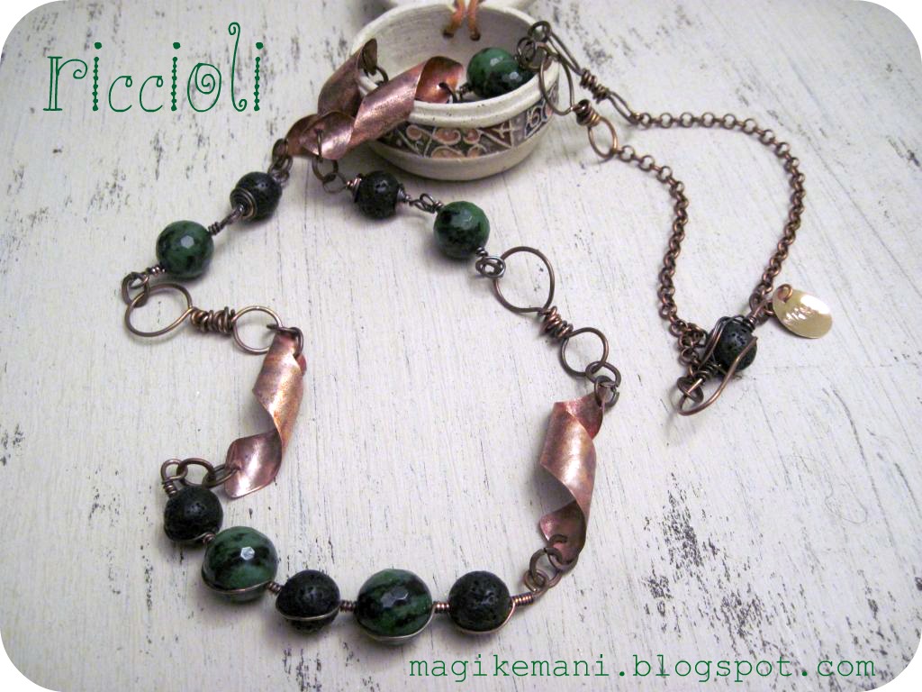 riccioli che fanno da link tra le perle di Lava nere e le belle perle sfaccettate di Rubino Zoisite che trovo stia benissimo con il nero e con il rame…