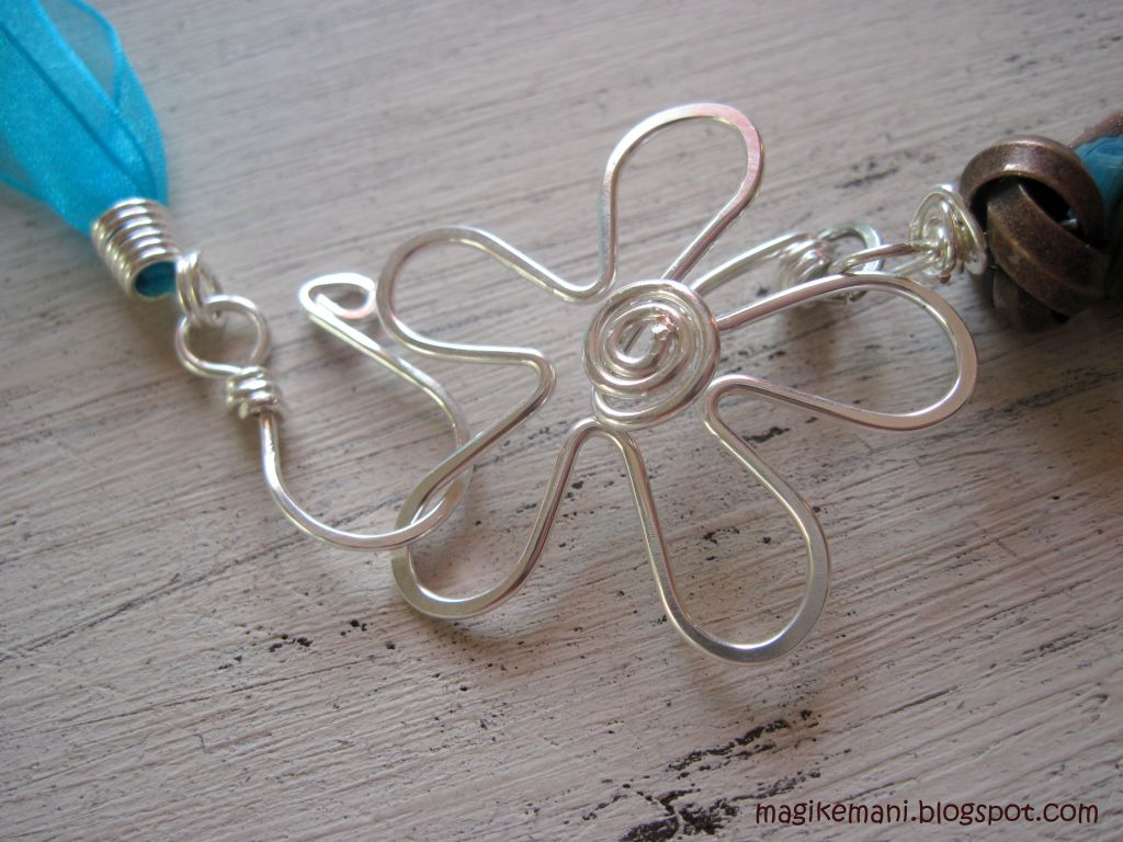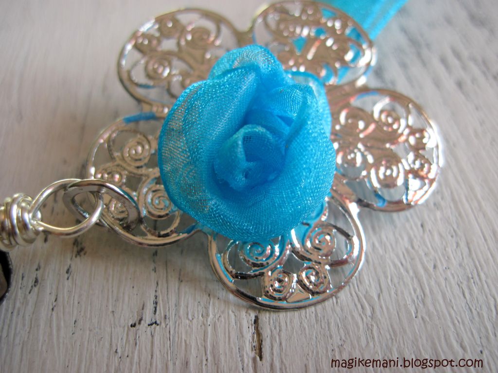 Magnifica la collana, l'abbinamento di colori e materiali piace molto anche a me! E il dettaglio della rosa di organza che esce dalla filigrana d'argento e' fantastico!