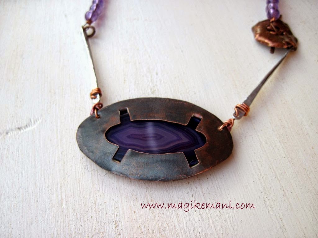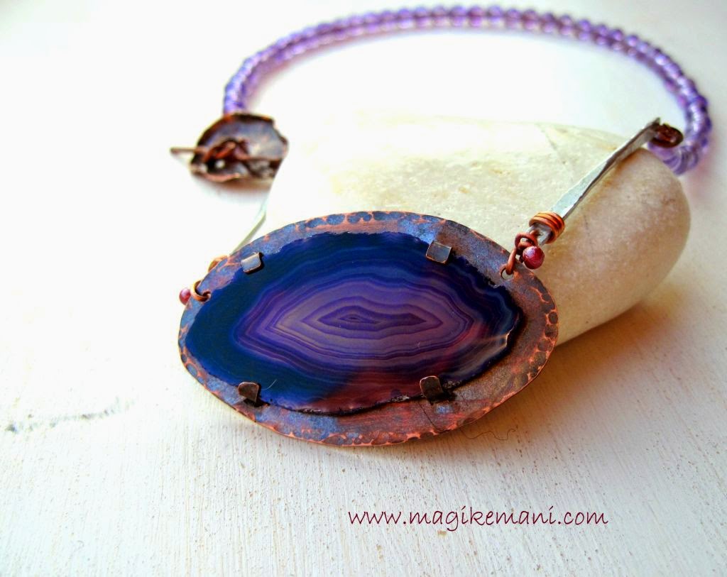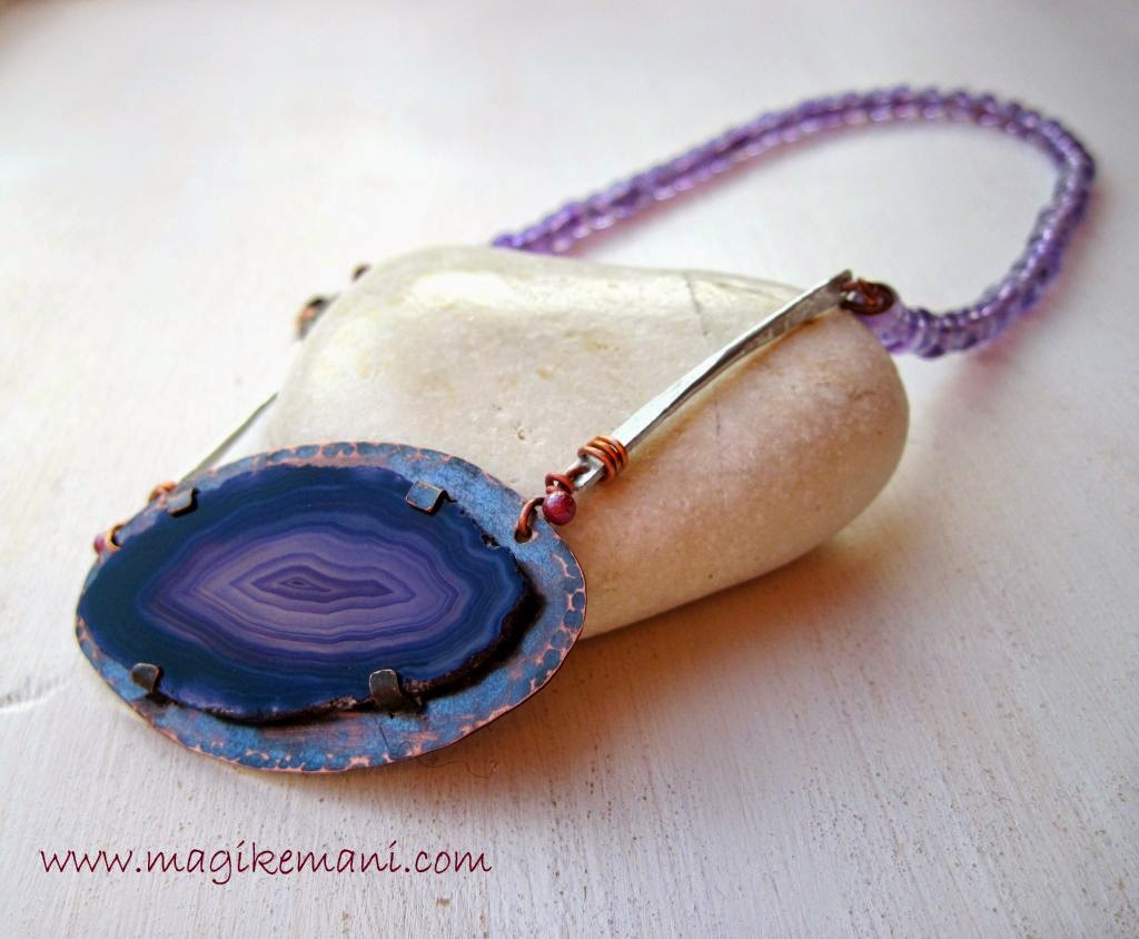 Tutto nasce da una fettina di agata (così la chiamo io) trovata nel “cestino dei minerali” di Celine (Mani di Perla) da li l’idea di creare un ciondolo con cold connections ovvero connessioni a freddo, senza brasatura, saldante e saldatura ma andando solamente a creare delle graffette che sostengono la pietra.