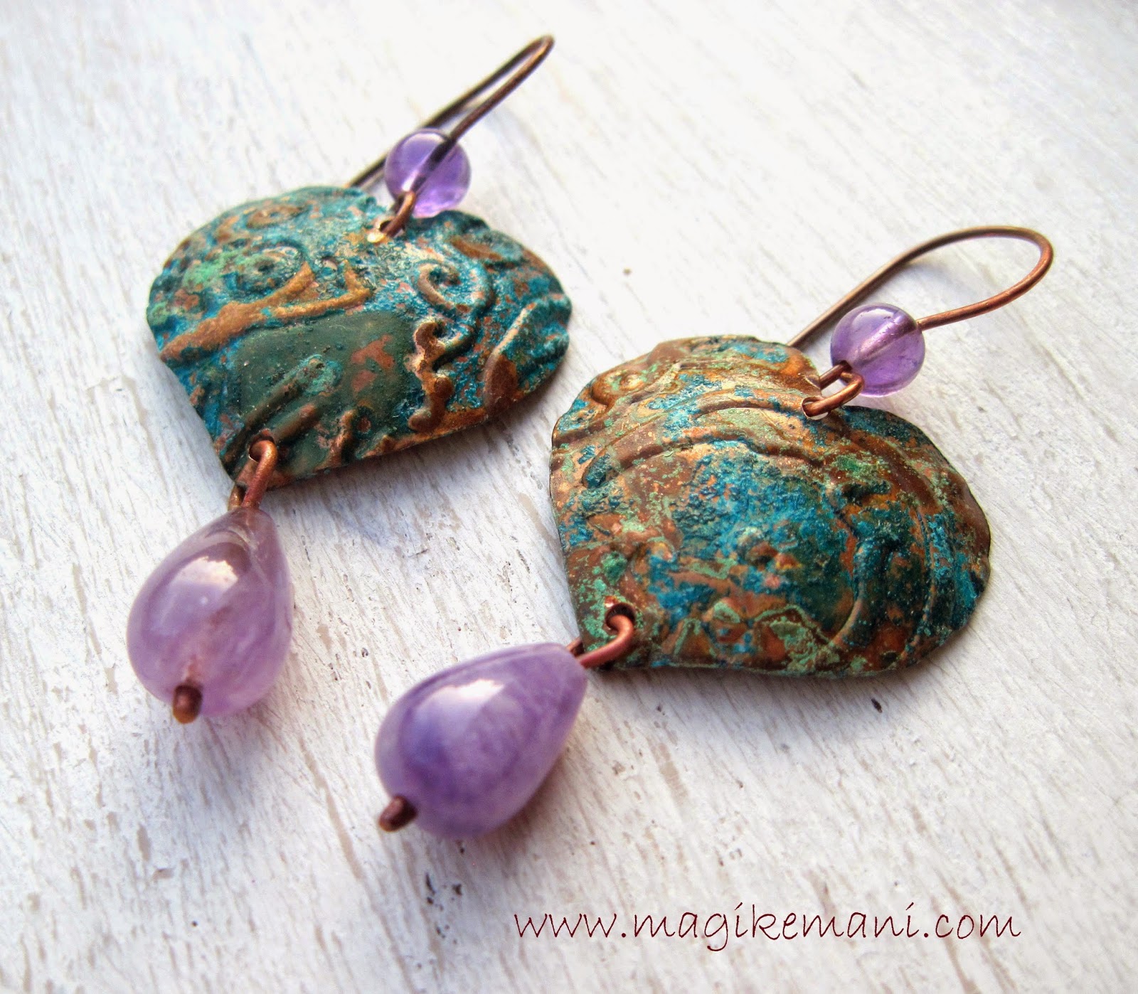 rame, patina creata con le patatine, goccia di ametista e pallino di ametrino