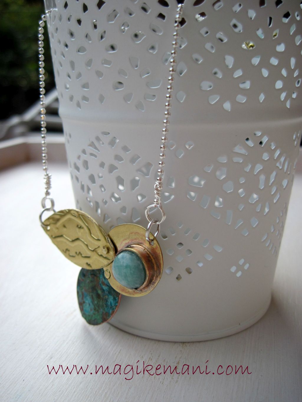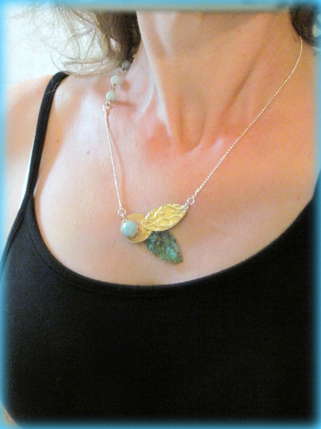 Il resto è una catenella argentata a pallini, e tre perle di amazzonite. Le foglie sono legate ai castoni da piccoli rivetti