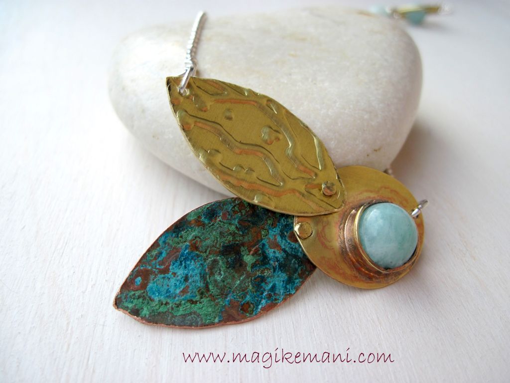 un piccolo castone di amazzonite, questa pietra dal colore stupendo, abbinata all’ottone. Una foglia in ottone lavorata con tecnica embossing, e la foglia in rame con questa bella patina, ricavata da un cuore che non trovava la sua giusta collocazione. Saldando l’ottone con il rame è inevitabile che rimangano delle tracce. Lavorando bene di carta vetrata e lana acciaio si riesce a pulire bene, ma in questo caso ho voluto lasciare un po’ di patina di rame perchè si fondesse con il rame della foglia patinata.