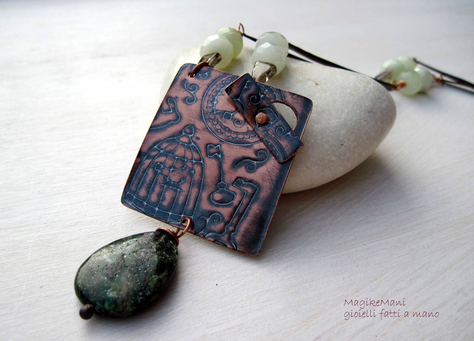 un ciondolo inciso meccanicamente con un motivo molto shabby, che fa da chiusura a T