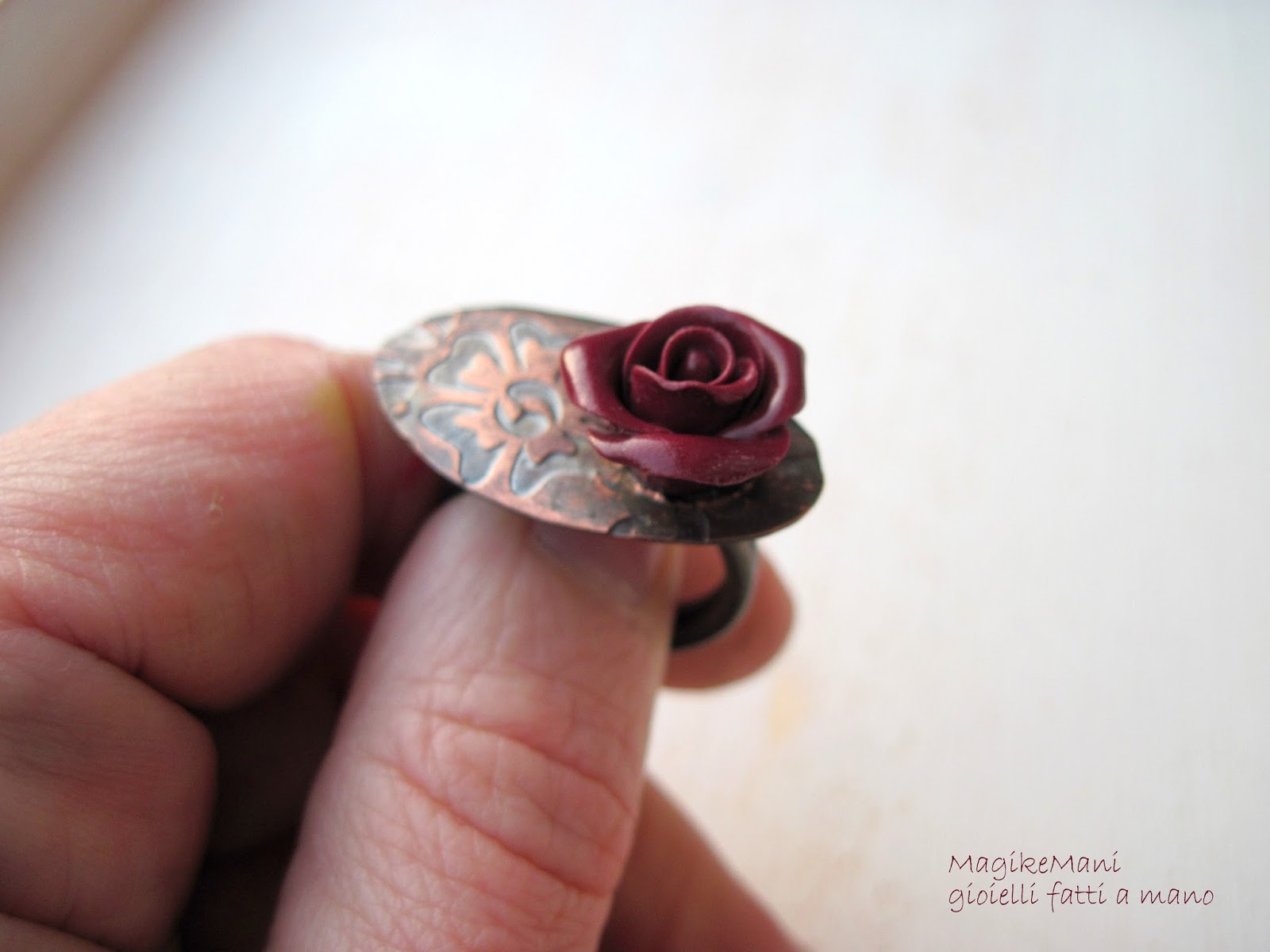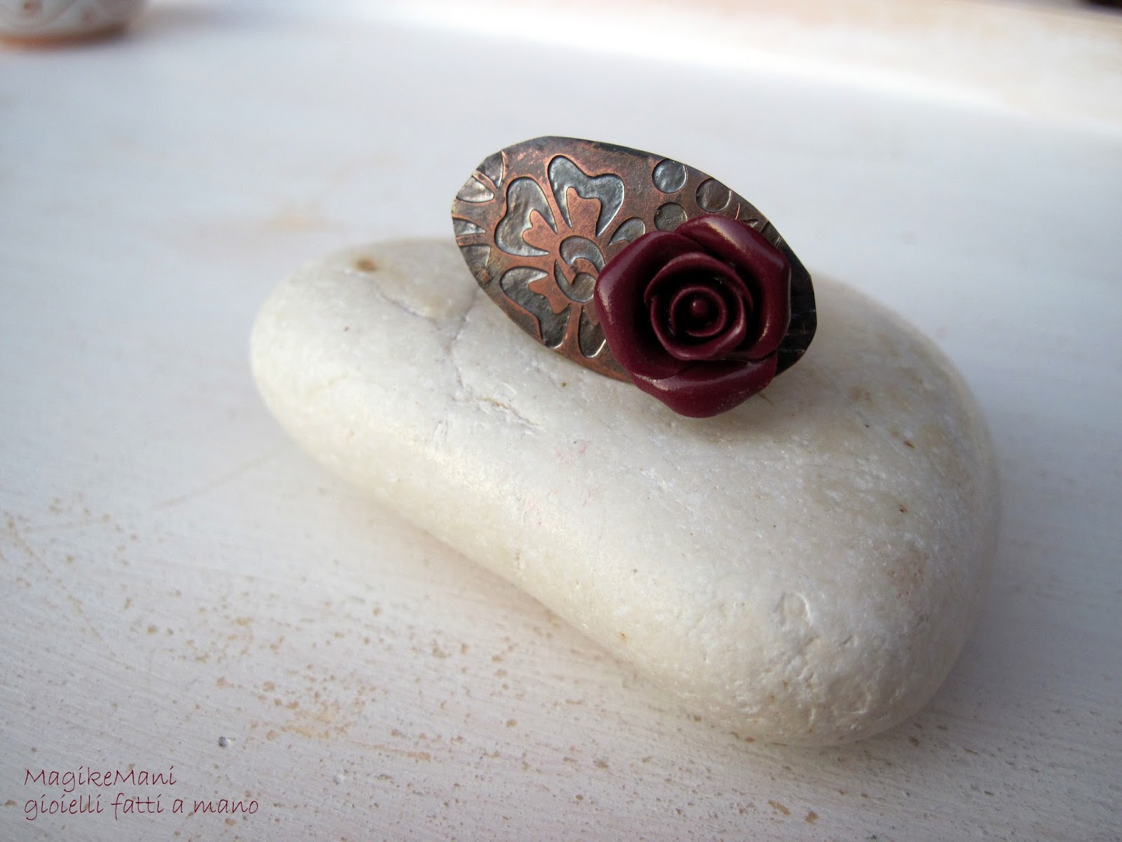 Considero le piccole rose di Sara un vero gioiello, apprezzato da moltissime persone di tutte le età fatte e rifatte in ogni colore. E’ così che un giorno una piccola rosa ha cominciato il suo viaggio, è capitata vicino ad un pezzetto di rame inciso, un pezzo di scarto uno di quei pezzi che taglia e trafora diventano inutilizzabili.