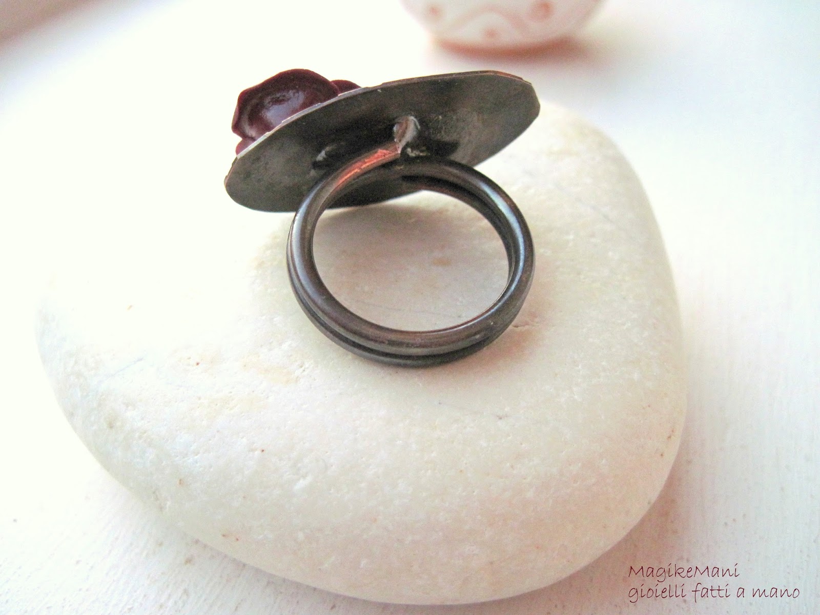 la piccola rosa bordeaux realizzata petalo per petalo senza l’utilizzo di stampi, ogni rosa è unica e diversa.