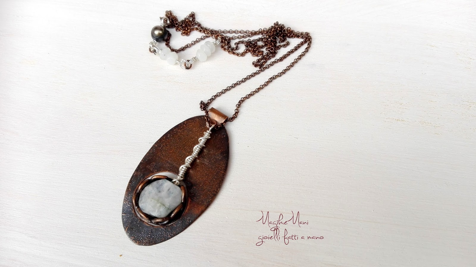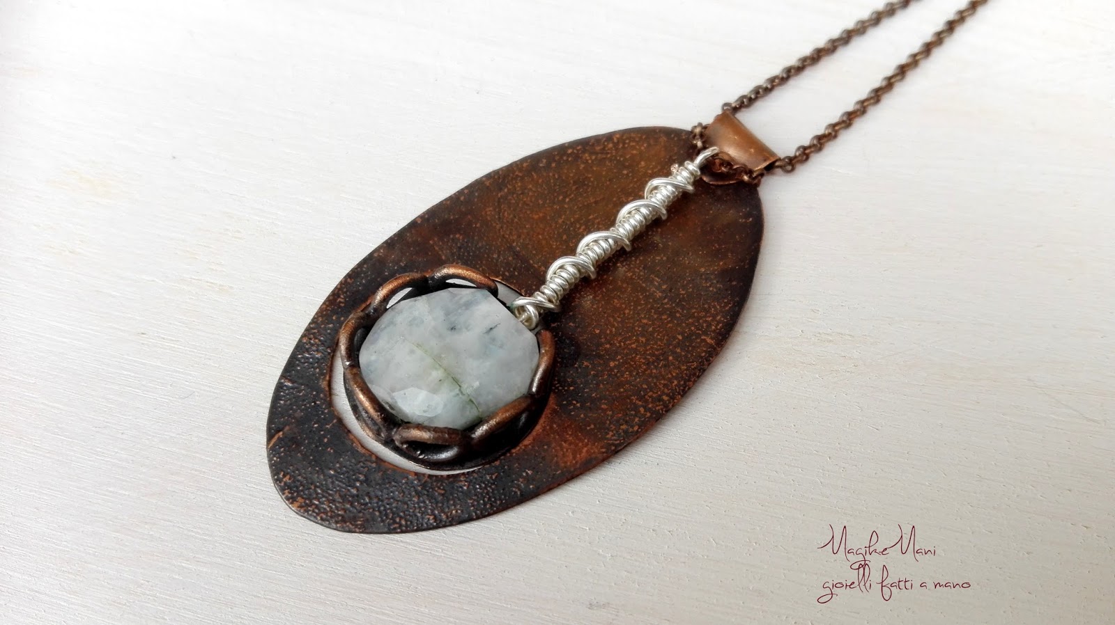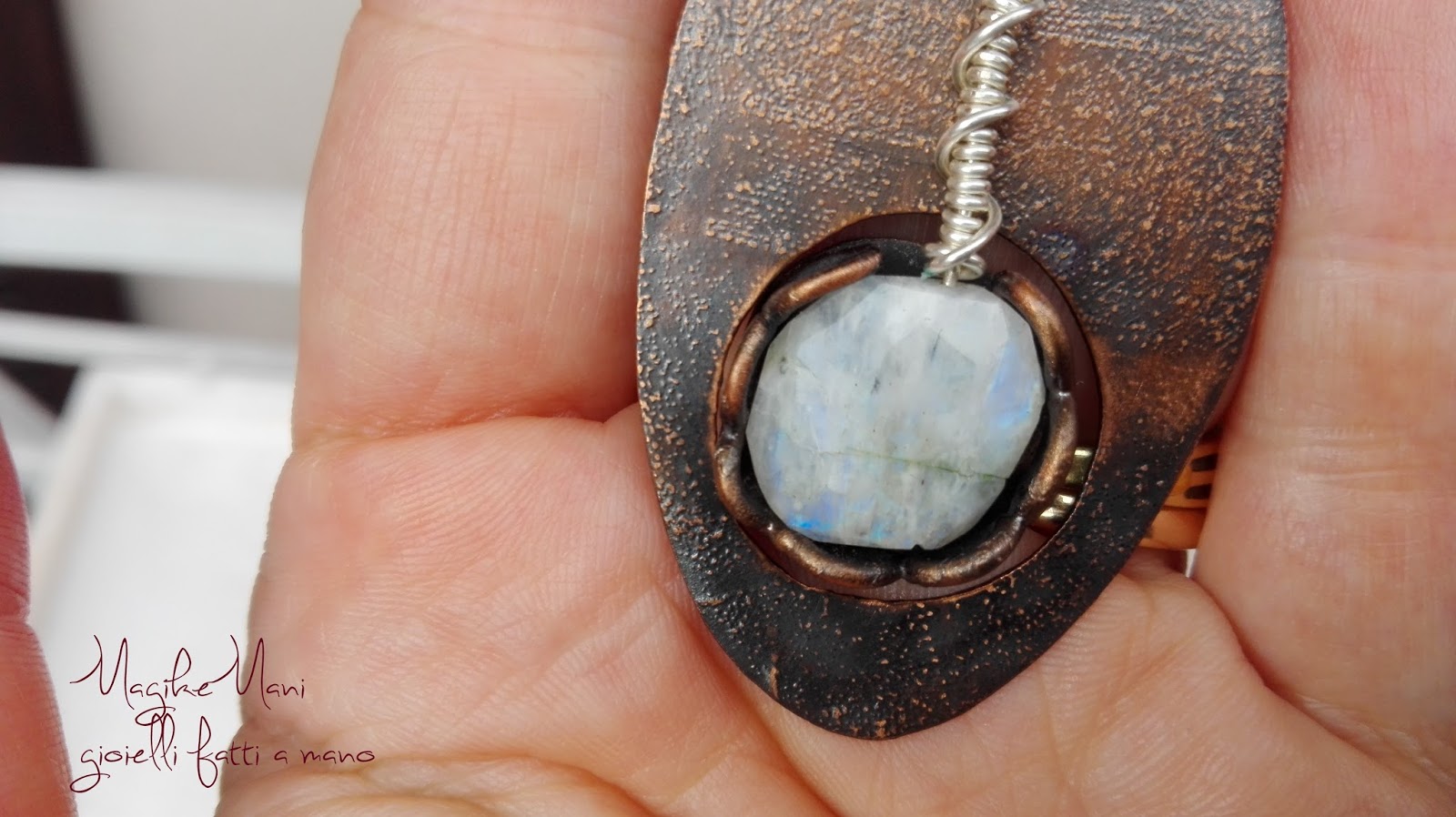 Il ciondolo è formato da un ovale di rame con un pendente: la particolarità sta nella bastina formata da piccoli anellini saldati tra loro. La pietra è una bellissima pietra di luna con i suoi bellissimi riflessi cangianti blu. Presenta una screziatura che ho deciso di lasciare come se fosse un “segno particolare”